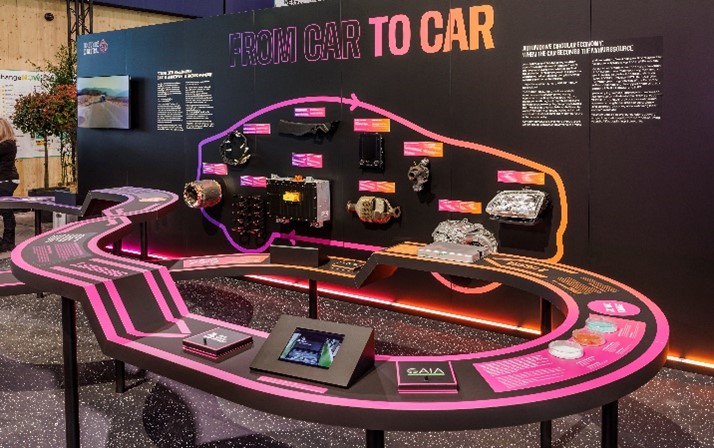 Les équipes Hopscotch ont imaginé une présentation attrayante et stimulante, avec une touche éducative. La proposition créative ? “Discover the loop of eco-solution from car to car” (« Découvrir la boucle de l’éco-solution d’une voiture à l’autre ») : un parcours d’exposition où des pièces de voiture ont été valorisées avec des encarts explicatifs marié avec un ton ludique et accessible pour engager l’audience !